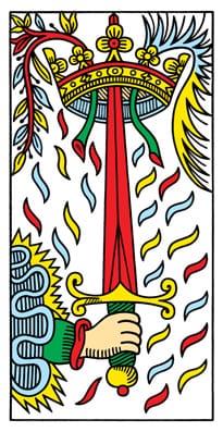マルセイユタロットカードからは「ソードのエース」ー思考、理性、知性のスートの代表、1番のカードです。各タロットカードにより、絵柄はさまざまですが、ソードのエースというと、大抵は中央に大きな剣、それをグッと握りしめる力強い手と共に描かれていますよね。